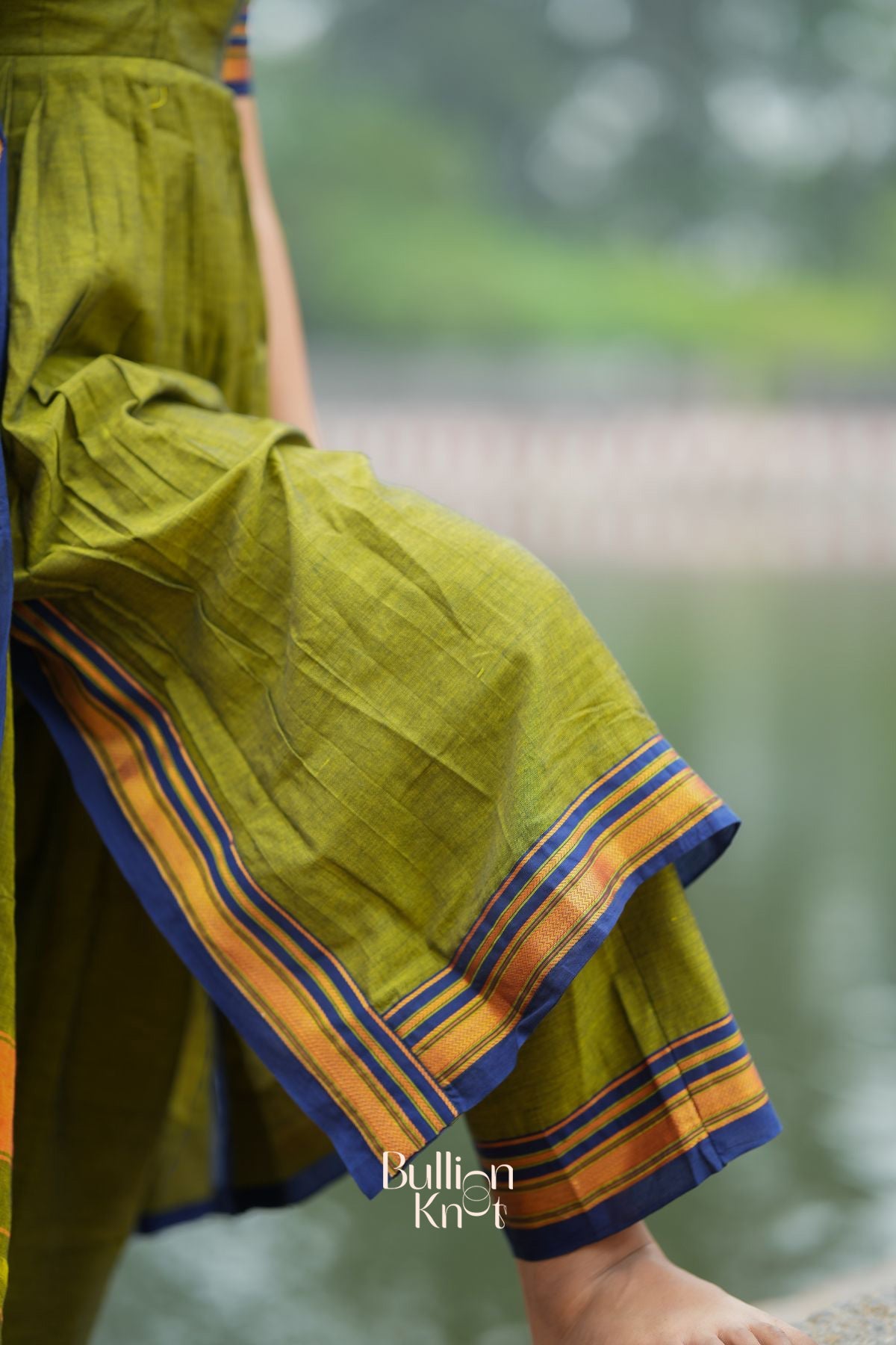 Presenting a Syahi Handloom Suit Set in Olive Green. It's the perfect, vibrant, elegant, rich olive color outfit. This handloom kurta suit set features a detailed classic collar neckline, making it an ideal choice for office wear. The thread-weaving border along the edges of the handloom cotton fabric adds an ethnic charm. Complementing the kurta suit set with a matching dupatta in the same colour enhances the richness and sophistication of the look. The kurta incorporates a pleat to ensure comfort. The pocket is available in pants for ease and convenience, making it perfect for cultural events, festive celebrations, or even home-gathering ceremonies.