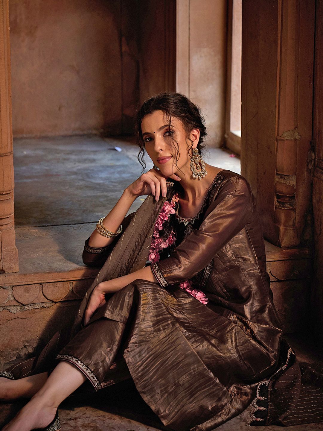 Brown embroidered Kurta with Trousers with dupatta
