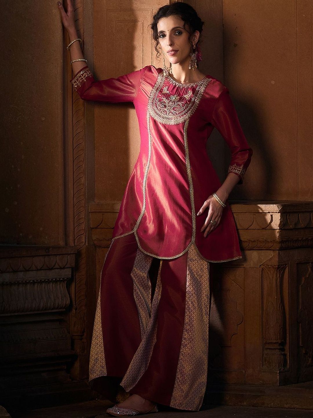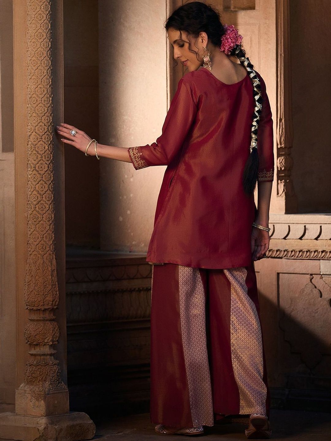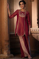 Maroon and gold toned embroidered Kurta with Palazzos