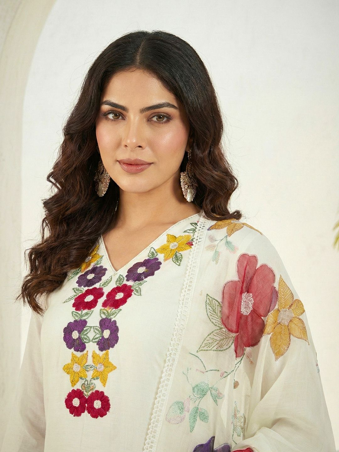 Dhiyona CH Women Floral Embroidered Regular Thread Work Kurta with Trousers & With Dupatta