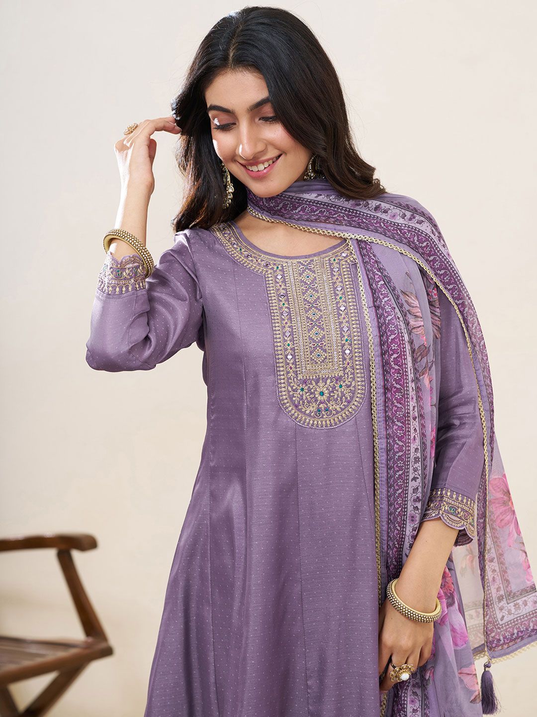 Lavender & Beige Printed Kurta with Trousers & Dupatta