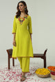 Bright and stylish, this lime yellow kurta set is crafted from breathable cotton with stunning embroidery. The 3/4th sleeves and flared design provide an effortlessly chic and comfortable look, ideal for day-to-night wear. Kurta Material : Cotton || Pant Material : Cotton Style: Flared Kurta || Calf Length with 3/4th Sleeve Package contain: Top || Pant