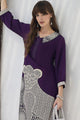 Purple and white printed tunic, has a V-neck and three quarter sleeves