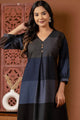Blue and black checked tunic, has a v-collar neck and three quarter-sleeves, secured with slip-on closure