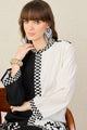 Black and white colourblocked tunic, has a mandarin collar neck and long sleeves
