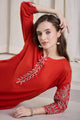 Rust embroidered tunic, has a v-collar neck and three quarter sleeves, secured with slip-on closure