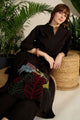 Black and charcoal embroidered a-line kurta, has a v neck and three quarter sleeves, secured with slip-on closure