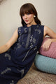 Blue embroidered tunic, has a mandarin collar and sleeveless