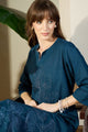 Blue embroidered top, has a round neck and three-quarter sleeves