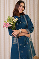 Teal blue and white embroidered tunic, has a shirt collar neck and three-quarter sleeves, secured with slip-on closure