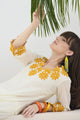 White & yellow embroidered top, has a v neck and three quarter sleeves, secured with slip on closure