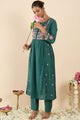 Sea Green embroidered tunic, has a round neck and three-quarter sleeves, secured with slip-on closure