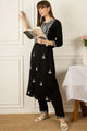 Black colored embroidered tunic, has a round neck and three-quarter sleeves, secured with slip-on closure