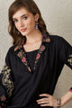 Black embroidered top, has a shirt collar and three-quarter sleeves