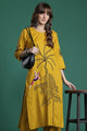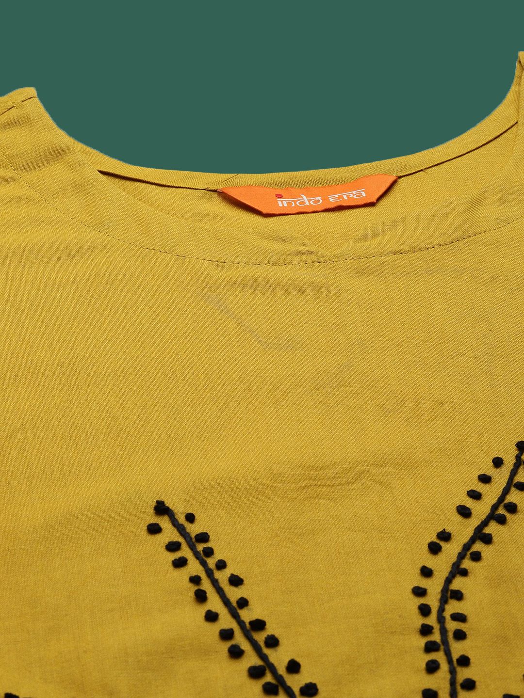 Mustard embroidered Tunic has round Neck collar, Three quarter Sleeves, Slip-on closure regular waist hem