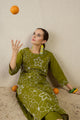 Green Embroidered tunic has a round neck and three quarters, slip-on closure