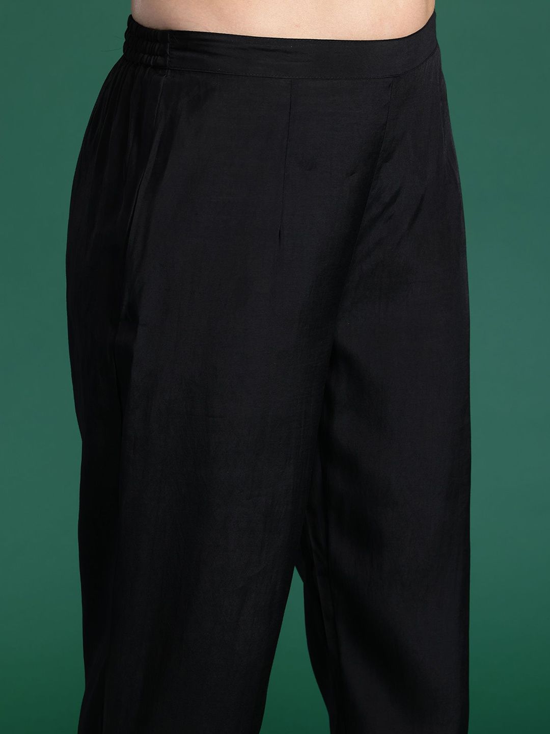 Black solid trousers, has elasticated waistband with slip-on closure, 2 pockets