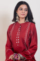 Red and white Embroidered top, has a mandarin collar neck and long sleeves, secured with slip-on closure