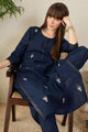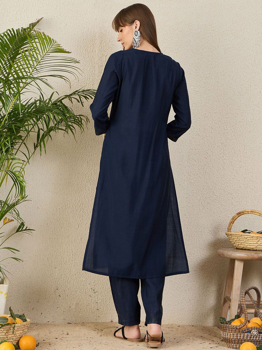 Blue embroidered tunic, has a a round neck and three quarters sleeves, secured with slip-on closure