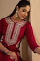 Maroon embroidered tunic, has a round-neck and three quarter sleeves, Secured with slip on closure