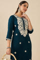 Teal green embroidered tunic, has a round neck and three quarter sleeves, Secured with slip on closure