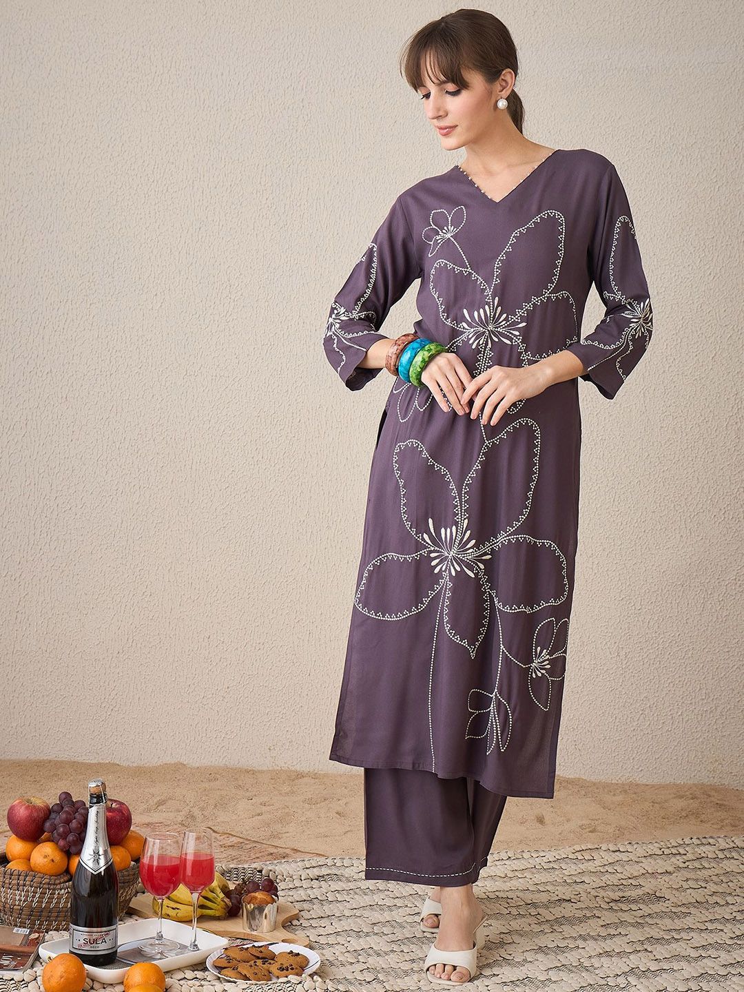 Dhiyona IE Embroidered V-Neck Straight Tunic With Palazzo