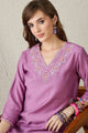 Lavender-colored embroidered top, has a v neck and three-quarter sleeves
