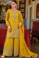 Mustard, white and green embroidered kurta with palazzos and dupatta