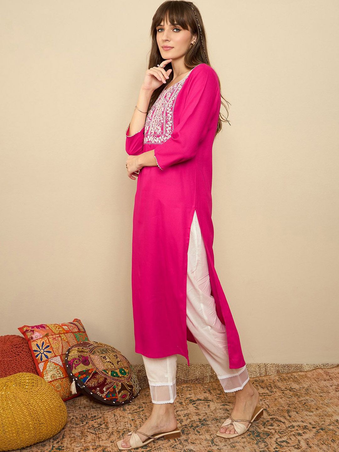 Dhiyona IE Ethnic Motifs Embroidered Round Neck Thread Work Straight Kurta