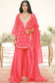 Pink,magenta and white ethnic motifs embroidered kurta with palazzos and dupatta