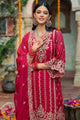 Red and gold-toned embroidered kurta with trousers and dupatta