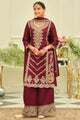 Maroon, yellow and gold toned embroidered Kurta with Palazzos and dupatta