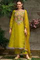 Yellow, blue and pink embroidered kurta with trousers and dupatta