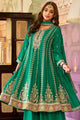Teal, coral and gold toned embroidered kurta with palazzos and dupatta