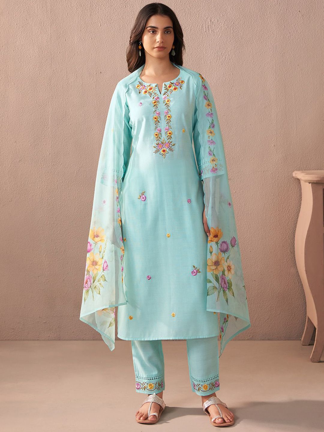 Dhiyona IE Floral Embroidered Notch Neck Straight Kurta With Trouser And Dupatta