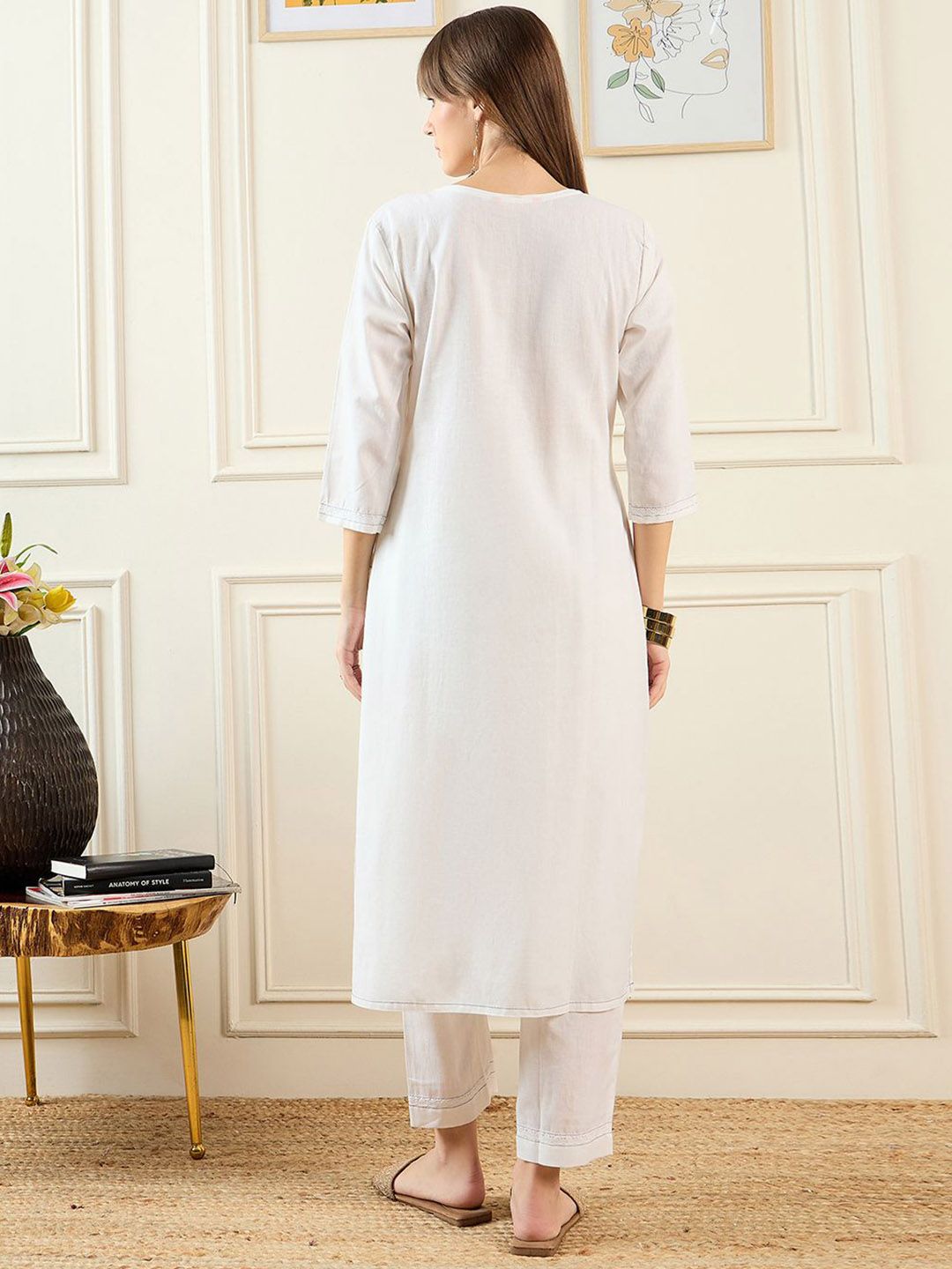 Dhiyona IE Floral Embroidered Notched Neck Pure Cotton Straight Kurta With Trousers