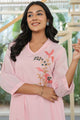 Pink embroidered tunic, has a spread collar and three quarter sleeves, secured with slip-on closure