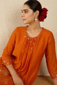 Orange colored and silver-toned embroidered tunic, has a round neck and three quarter sleeves, secured with button closure