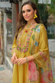 Yellow, pink and green embroidered kurta with trousers and dupatta