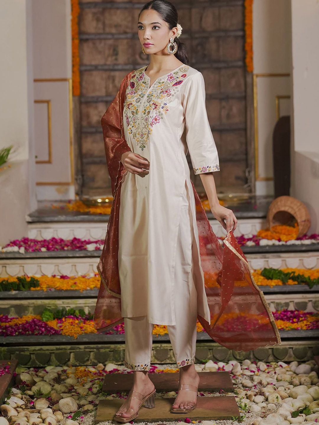 Dhiyona IE Floral Embroidered Thread Work Liva Kurta With Trousers & Dupatta