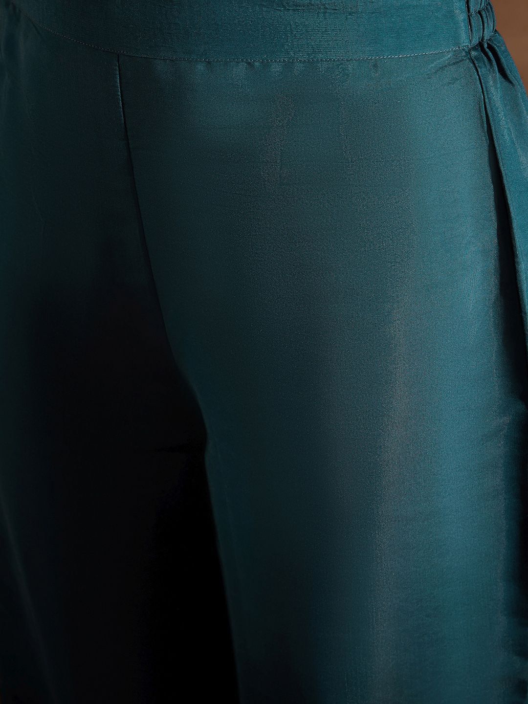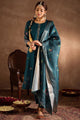 Teal blue, red and yellow embroidered kurta with trouser and dupatta
