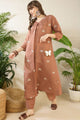 Brown floral embroidered tunic, has a v-neck and three-quarter sleeves, secured with slip-on closure