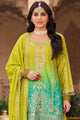 Green, yellow and gold-toned embroidered kurti with palazzos and dupatta
