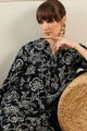 Black printed tunic, has mandarin collar, three-quarter sleeves, placket button closure and regular waist hem