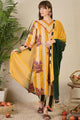 Yellow, pink and green printed kurta & trousers with dupatta