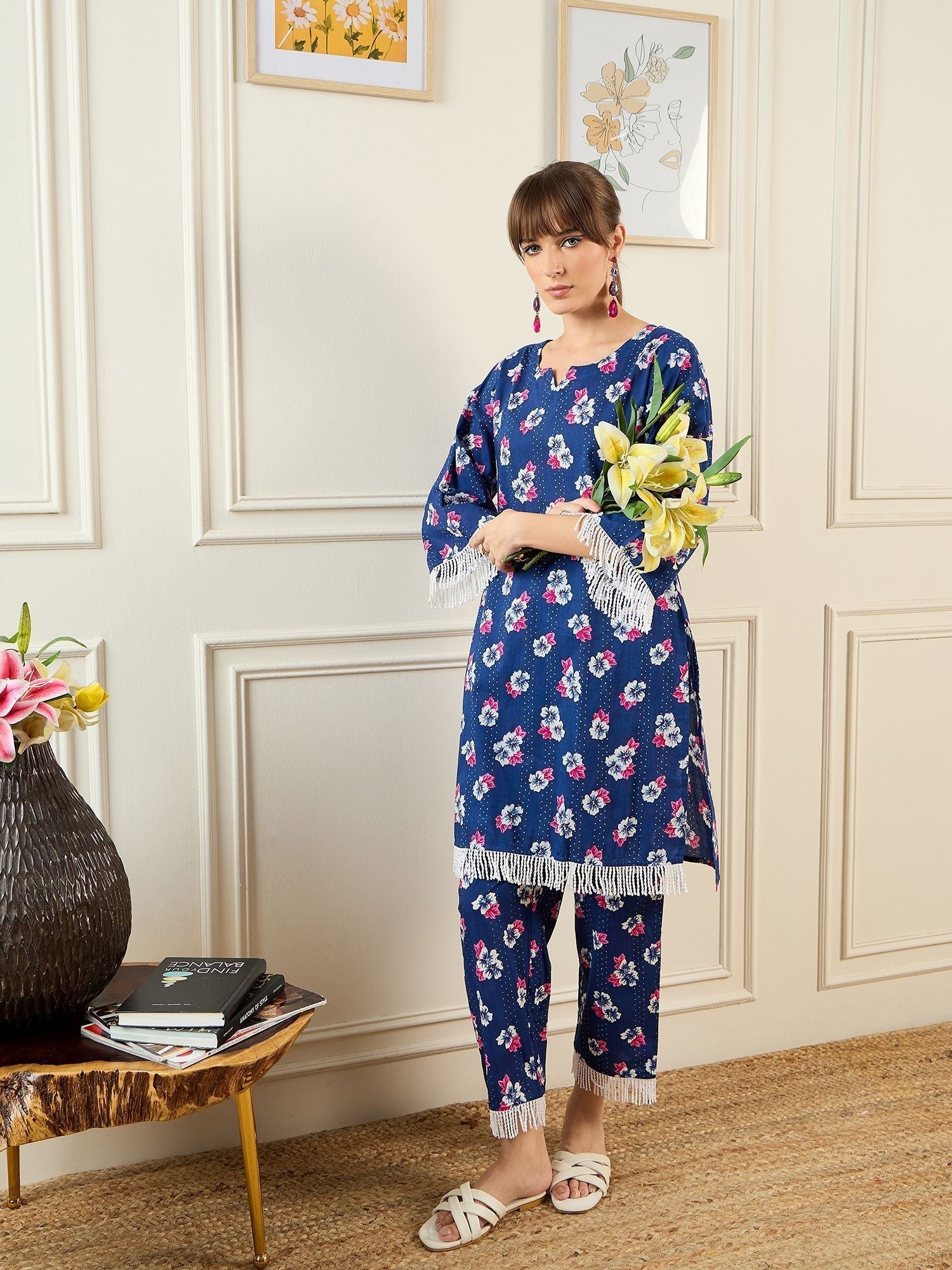 Dhiyona IE Floral Printed Pure Cotton Notch Neck Straight Kurta With Trousers