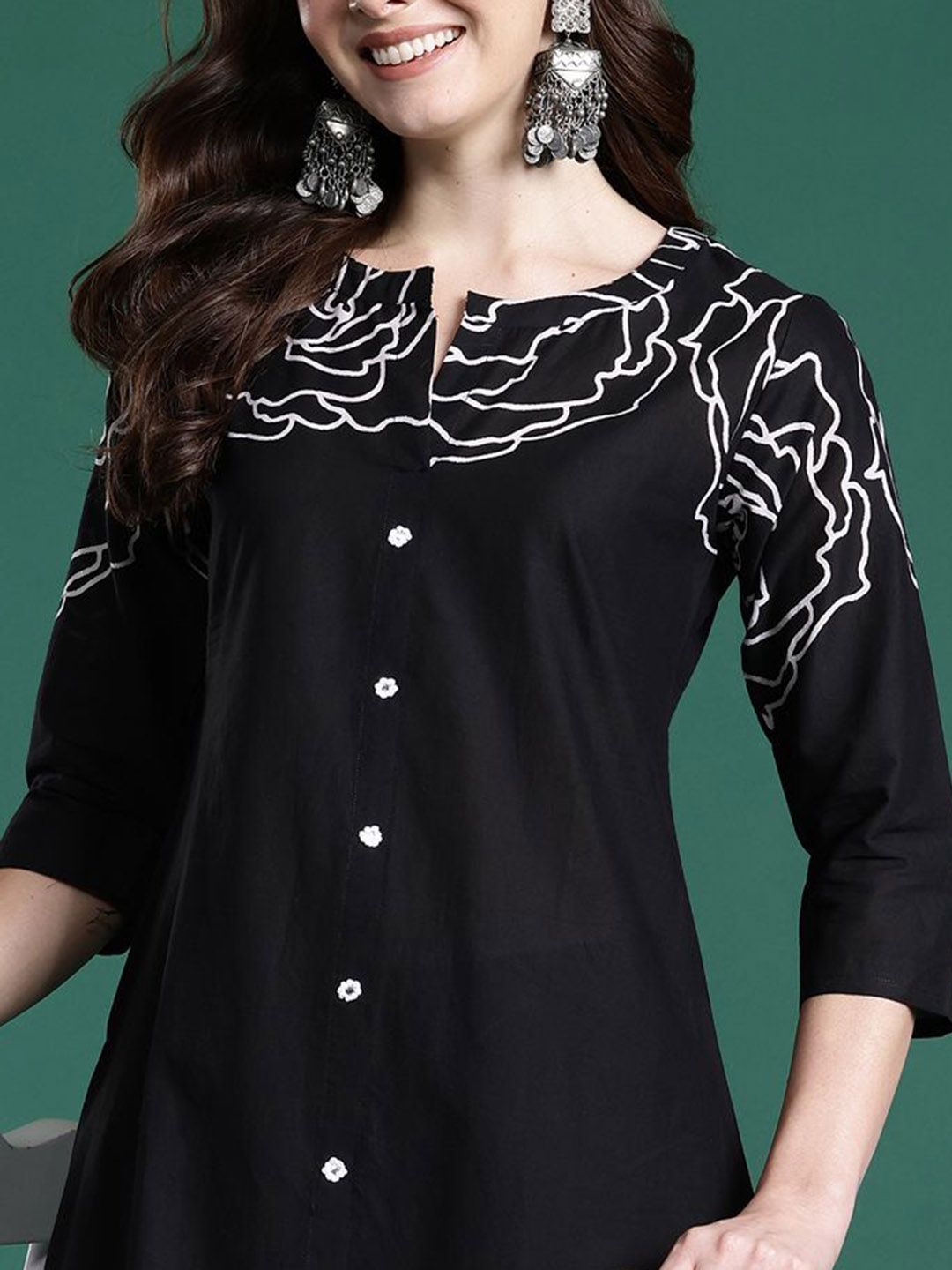 Black and white floral printed tunic, has a round neck with v-slit open and three-quartered sleeves, secured with slip-on closure with single pocket