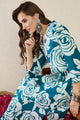 Teal-blue & white floral printed tunic has spread-collar and three-quarter sleeves with slip on closure