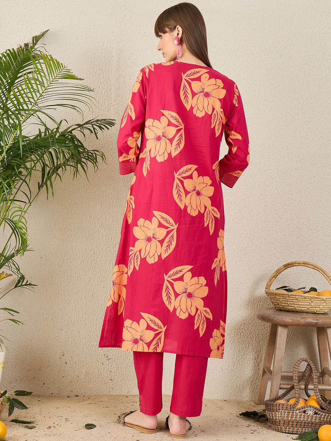 Dhiyona IE Floral Printed Pure Cotton V-Neck Tunic With Trousers Co-Ords