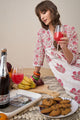 White and pink printed trousers, has elasticated waistband with slip-on closure, 2 pockets and flared hem